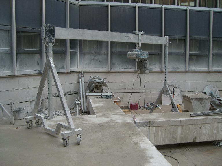 Er dient zum kontrollierten Herausziehen und Absenken von Betonblöcken, die nach dem Sägen von Wandöffnungen oder Durchbrüchen aus der Struktur gelöst werden müssen.
